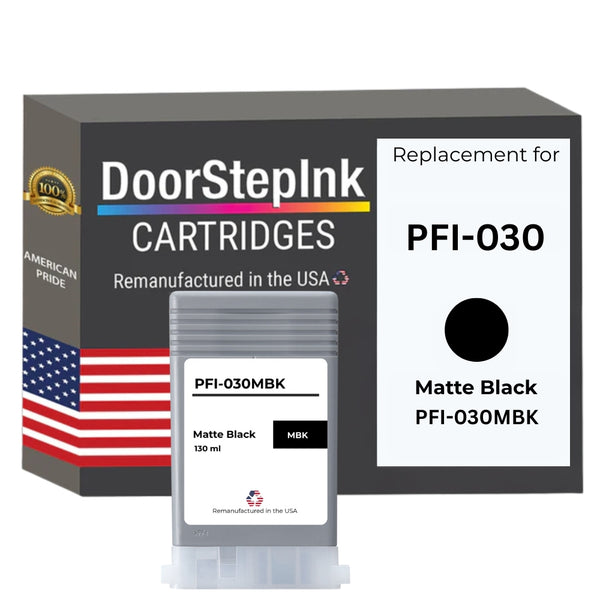DoorStepInk Brand for Canon PFI-030 130mL Matte Black Remanufactured in the USA Ink Cartridges, 3488C001 are the highest quality wide format replacement cartridges on the market. Using only Canon PFI-030 130mL Matte Black, we remanufacture each cartridge to the highest quality standards to match OEM ink level, color, and performance guaranteed!